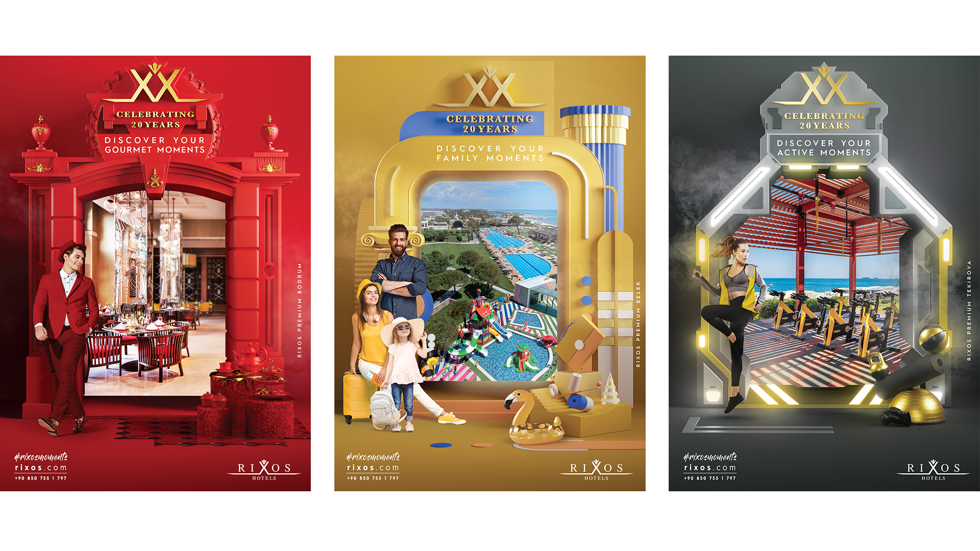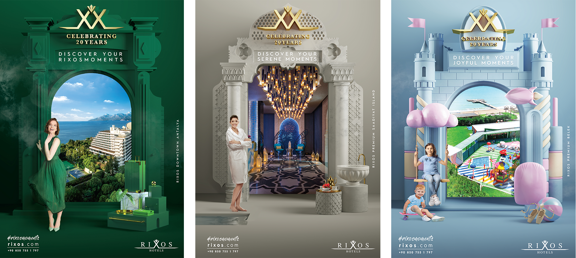 Advertisement designs for the "gates" concept of the campaign based on "Discover your Rixos Moments", prepared as part of the 20th Anniversary. Each version in the campaign images belongs to each different experience and location offered by Rixos hotels. The doors in the images are specially designed. Realized using 3D and prepared using photo manipulation.